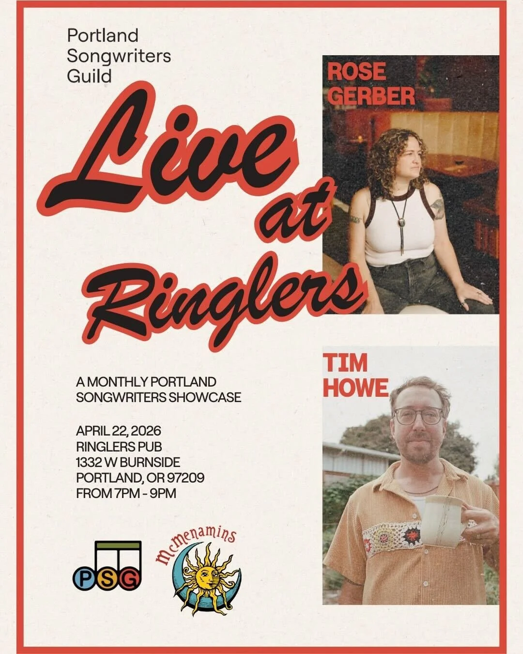 Portland Songwriters Guild is partnering with McMenamins to bring a monthly songwriter showcase to the famous Ringlers Pub on W. Burnside in NW Portland.